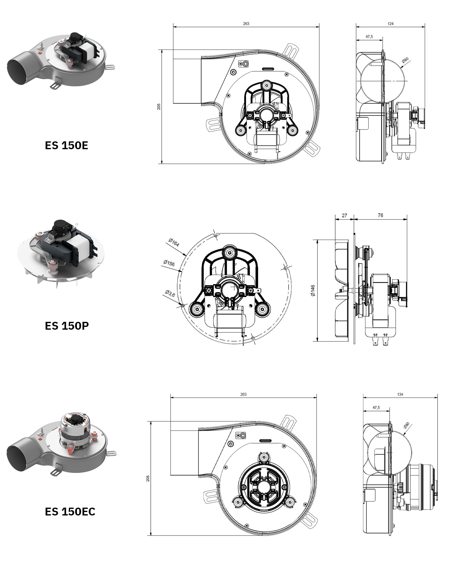 Estrattore fumi disponibile con motore a poli schermati o con motore a condensatore ad alta efficienza, chiocciola e girante in lamiera AISI 430.